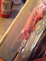 Now normally I would have base coated the entire coffin in black, and then play around with white, red, brown, gold, silver, copper to age the coffin, instead I went for the Amazing Casting Resin and the Alumilite metallic powders in different colors to base coat the coffin all over the outside. Below are three photos of what the coffin looked like after I covered it with the Amazing Cast Resin, metallic powders in bronze and silver and gold. After a couple of pours I waited for the resin to be completely set, what I love about this resin is that it sets in about 10 minutes depending on the temperature of the area you are working at, so even after a few layers it probably took me less than 30 minutes to finish the outside of the coffin. Once the resin wad dried, I started to play by adding red acrylic paint, it colors the resin really good and I used the wipe off and on method, not too much or too little the object was to give it a distressed look.