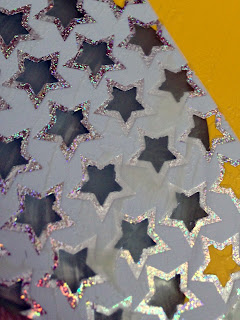 I had a sheet of tiny star stickers so I removed a few stars and took the sheet and placed it over one corner of the mirror, I wanted the stars to be frosted too but I wanted a bit of the shiny mirror to remain. The photo below shows the film I placed on a corner, I started to add the etching cream carefully making sure not to get any under the film, I wanted that area to remain shiny.