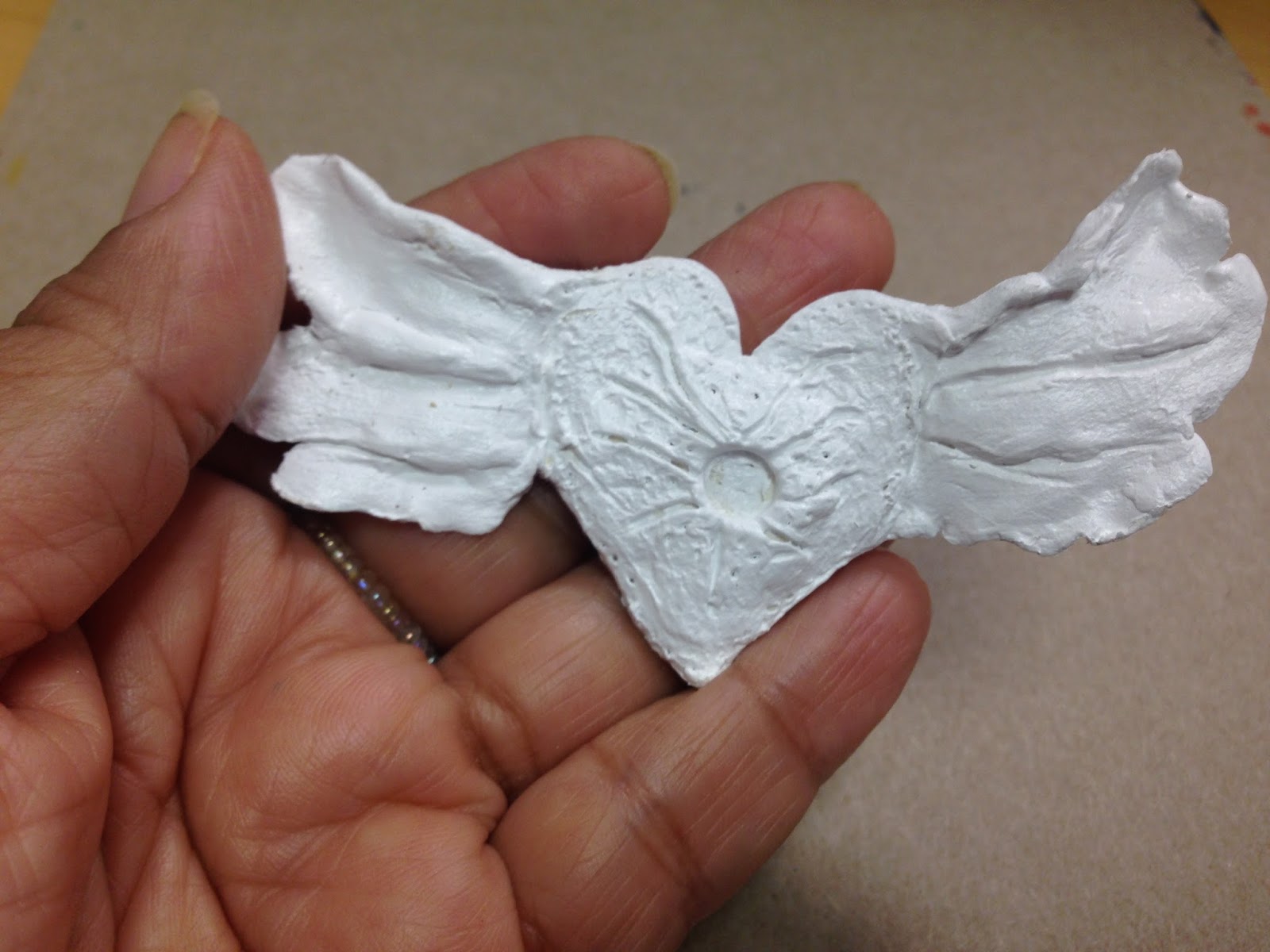 I created the heart first, it is a bit high in the center, I didn't want it to be flat, once I shaped the heart out, I simply carved some lines and added textured to the piece, once the heart dried, I started to add the wings little by little until I liked the end piece, this is not supposed to look "perfect" I wanted it have uneven sides, and the wings had to look different, this piece was handmade to be unique, I thought about making a mold but decided not to because this was to be unique and one-of-a-kind.